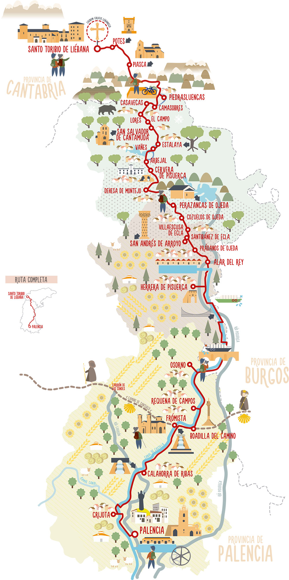 Los pasos le llevan a transitar durante kilómetros con la panorámica de los campos cerealistas en los que se suceden singulares pueblos con espectaculares iglesias, muchas de ellas joyas del románico. Dejando al oeste el embalse de Aguilar, la octava etapa hace noche en Cervera de Pisuega. Entonces ya se han confirmado los cambios paisajísticos que kilómetros atrás se presagiaban. Remontando el Pisuerga, la orografía y el paisaje ganan en intensidad. La proximidad al Cantábrico se deja notar. Robles, prados, pinares y hayedos toman ahora el protagonismo que antes era de la mies.