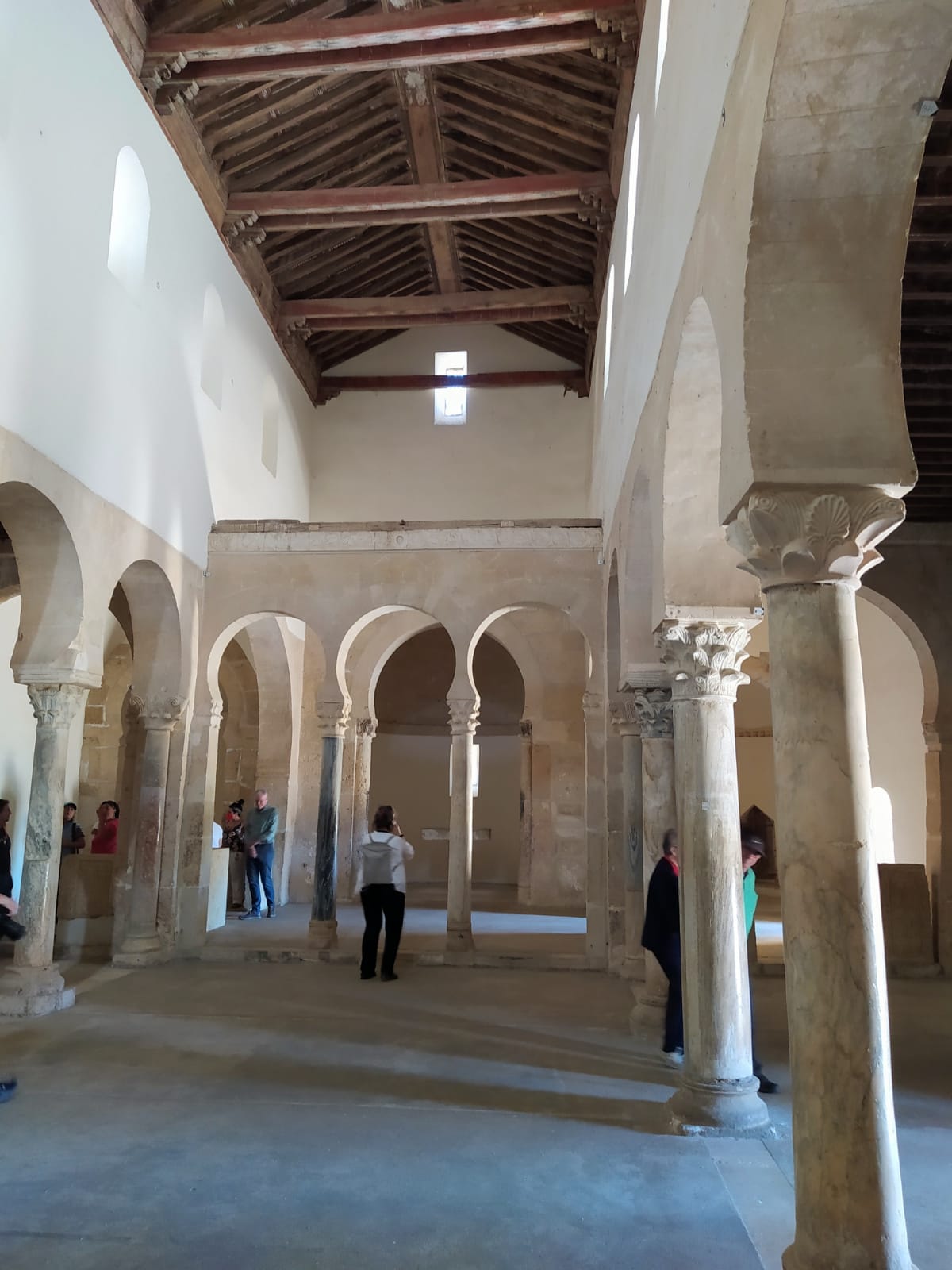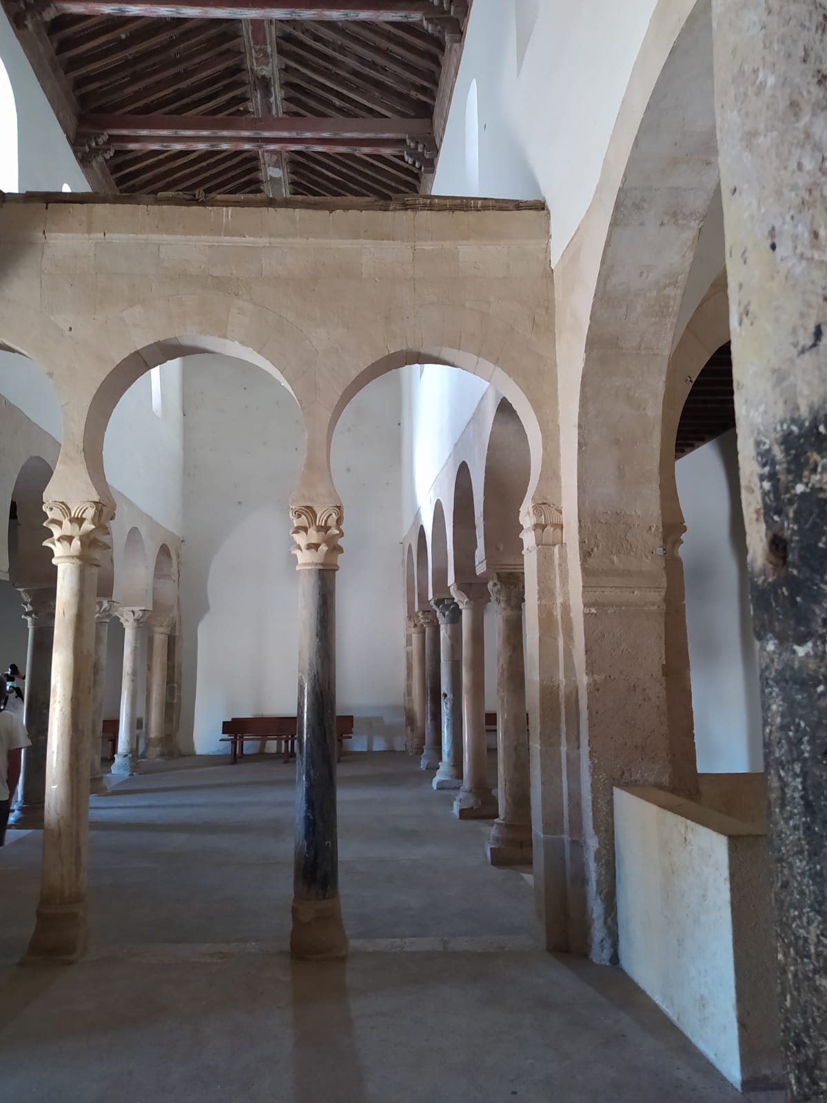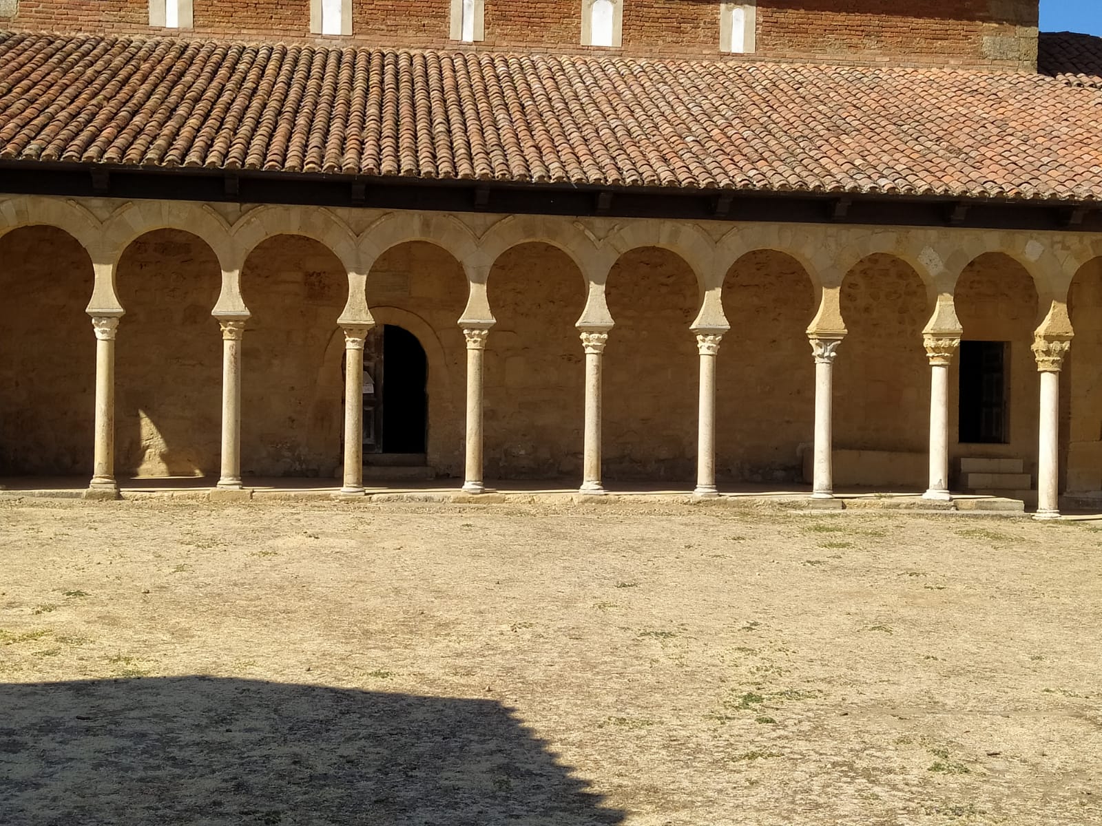 Pero si dentro es maravilla, fuera tampoco deja indiferente. el magnífico atrio o pórtico construido a mediados del siglo XI. De sus 12 arcos de herradura, los 7 más occidentales son mozárabes sobre fustes de caliza fina y basas, capiteles corintios y cimacios en mármol blanco.