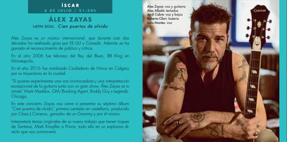 El castillo de Íscar tuvo la actuación de Álex Zayas en el patio de armas del castillo a las 21’30h. Se trató de una propuesta de Latin-Soul. Músico internacional, que durante casi dos décadas ha realizado giras por Estados Unidos y Canada. Además se ha ganado el reconocimiento de público y crítica. En el año 2006 fue telonero del Rey del Blues, BB King en Minneapolis. En el año 2016 fue nombrado Ciudadano de Honor en Calgary por su trayectoria en la ciudad.