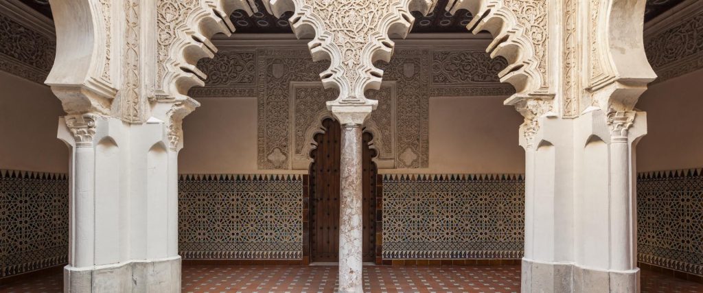 Nos sumergimos en la capilla dorada del convento, que nos recibe con sus arquerías ciegas sobre columnas con capiteles corintios y su cúpula almohade semiesférica, típica de las mezquitas, donde se hallaba el lugar reservado para las oraciones del califa.