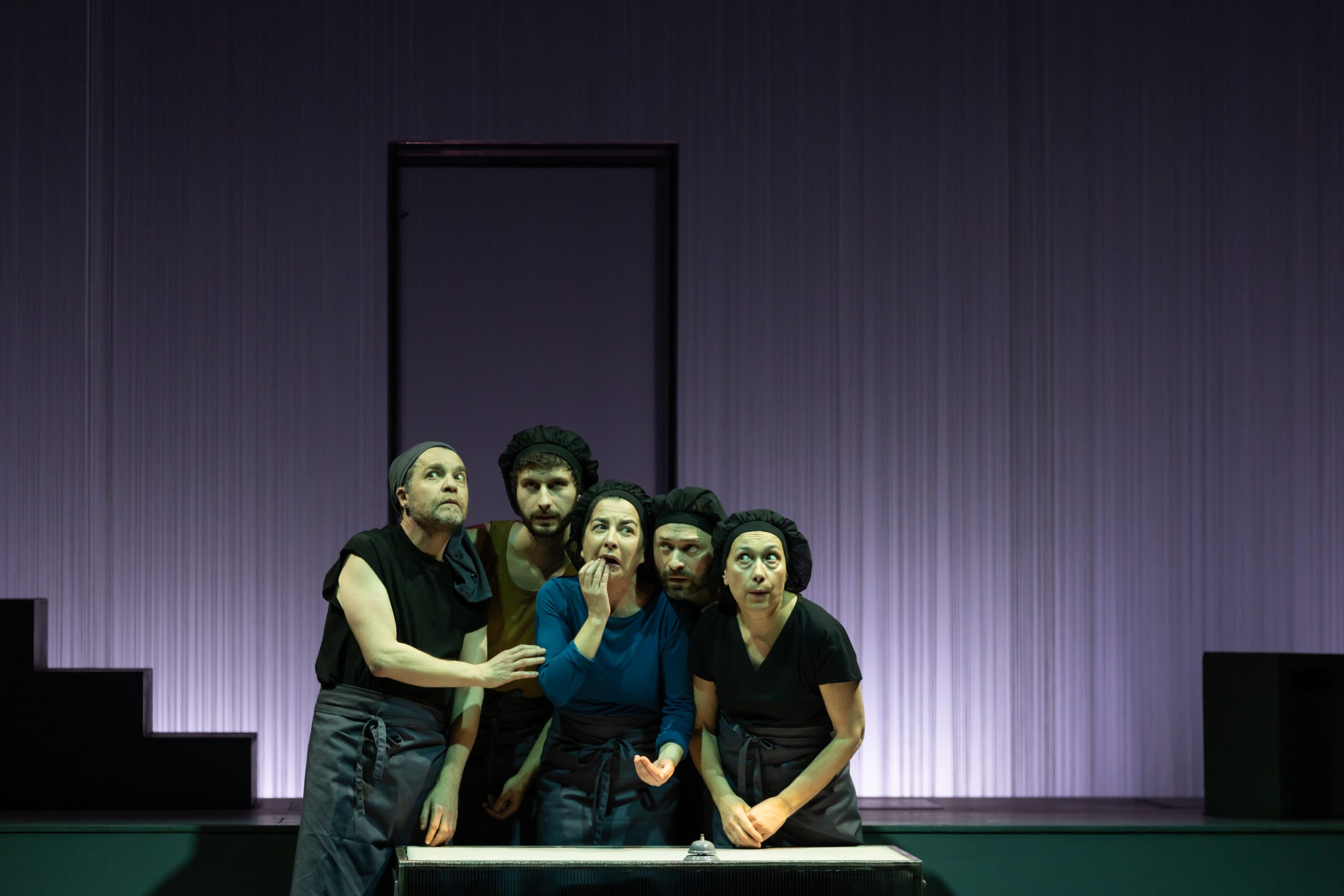 Los cinco actores de Sarabela asumen, bajo la magistral dirección de Ánxeles Cuña, el reto de interpretar a 17 personajes en casi medio centenar de escenas que se suceden a un ritmo frenético y cercano al lenguaje cinematográfico.