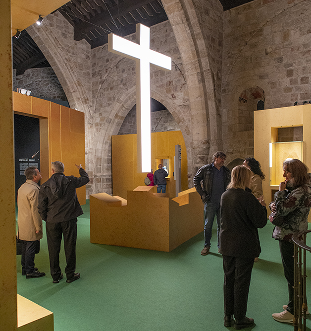 La estancia se abre con la cruz que parece flotar suspendida en el aire justo en el punto central. Alrededor podemos contemplar diversas esculturas en madera, alabastro y piedra policromada.
