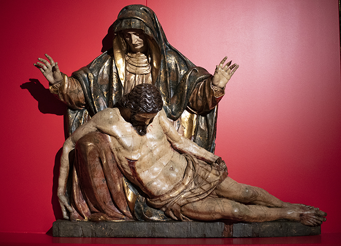 Otras obras como ‘San Sebastián’ o el ‘Martirio de San Bartolomé’ en madera policromada, lucen ricas vestimentas que nos traen a la mente a los sayones de los pasos de Valladolid dotados de prendas con vívidos colores y acuchilladas heredadas de los Lansquenetes de Carlos V.