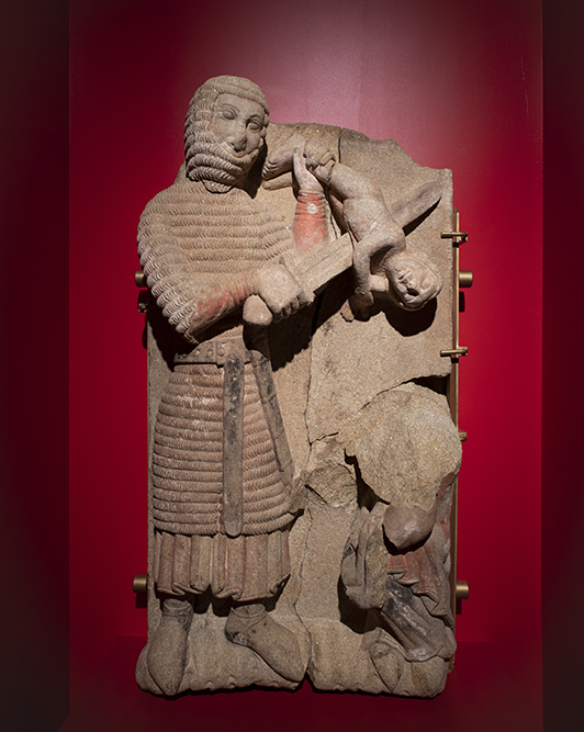 Hay una curiosa escultura de un soldado asesinando con impunidad a un pequeño niño que ha sido realizada en granito policromado.