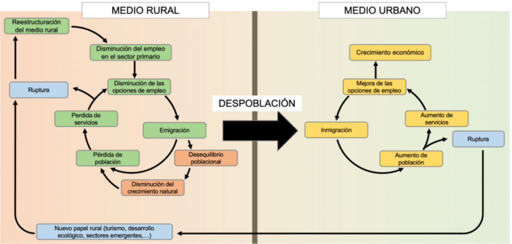 Por último, se produce una “masculinización” o mayor proporción de hombres, ligada a la economía agraria. Estos fenómenos, además, forman un bucle: la falta de servicios y oportunidades impulsa la emigración, especialmente de jóvenes y mujeres, lo que agrava la despoblación. El abandono rural no solo tiene consecuencias socioeconómicas, sino también ambientales. El cese de la agricultura y la ganadería tradicionales modifica el paisaje y afecta la biodiversidad.