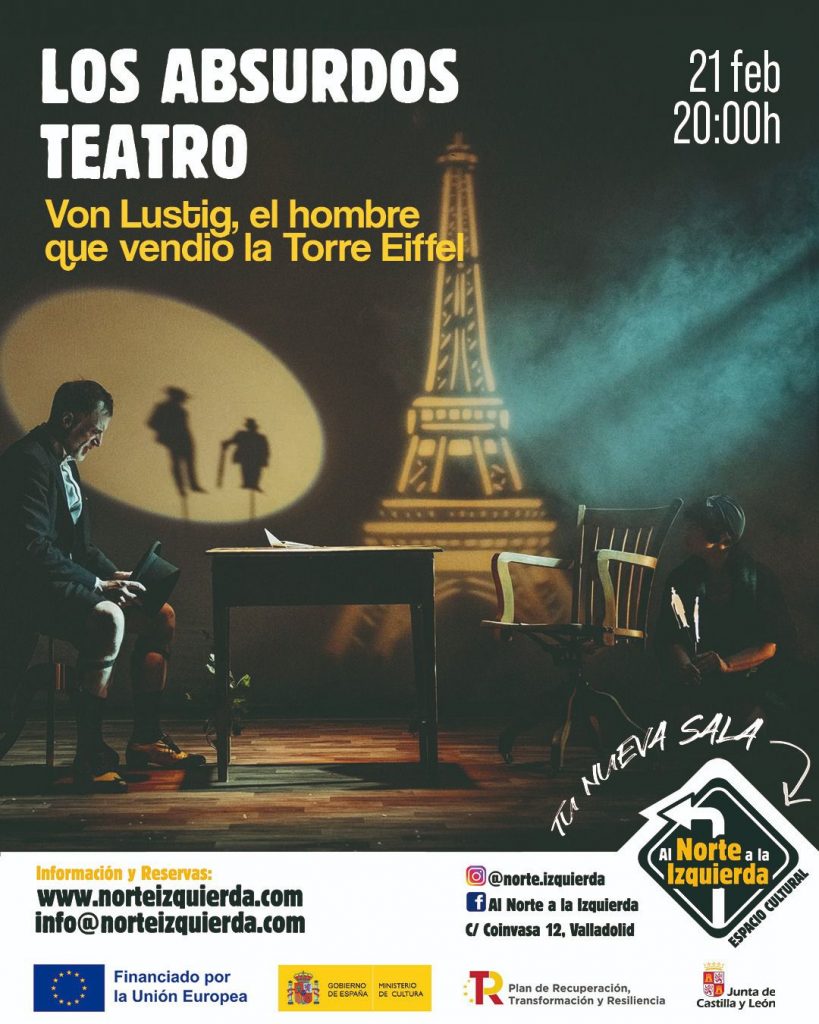 El sábado 21 de febrero la compañía Los Absurdos Teatro visita la sala Al Norte a la Izquierda con su espectáculo: ‘Von Lustig, el hombre que vendió la Torre Eiffel’.